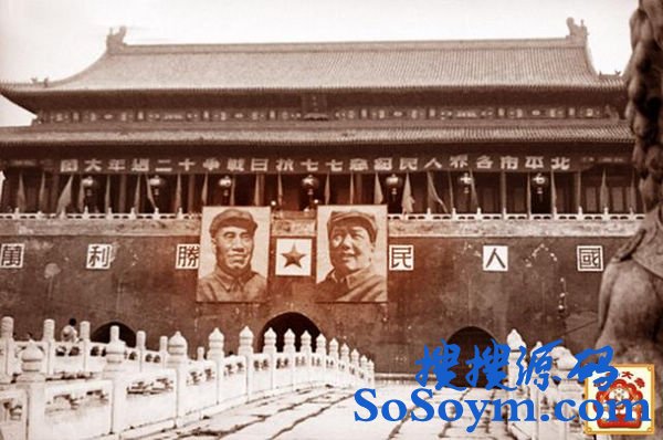 1949年7月7日,纪念抗战爆发12周年,天安门城楼上挂着毛泽东和朱德的相片。