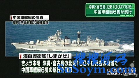 • 图注:经日海上自卫队巡逻机确认,中国海军舰艇编队6艘军舰22日-23日相继通过冲绳-宫古岛公海水道。图为中国海军导弹驱逐舰